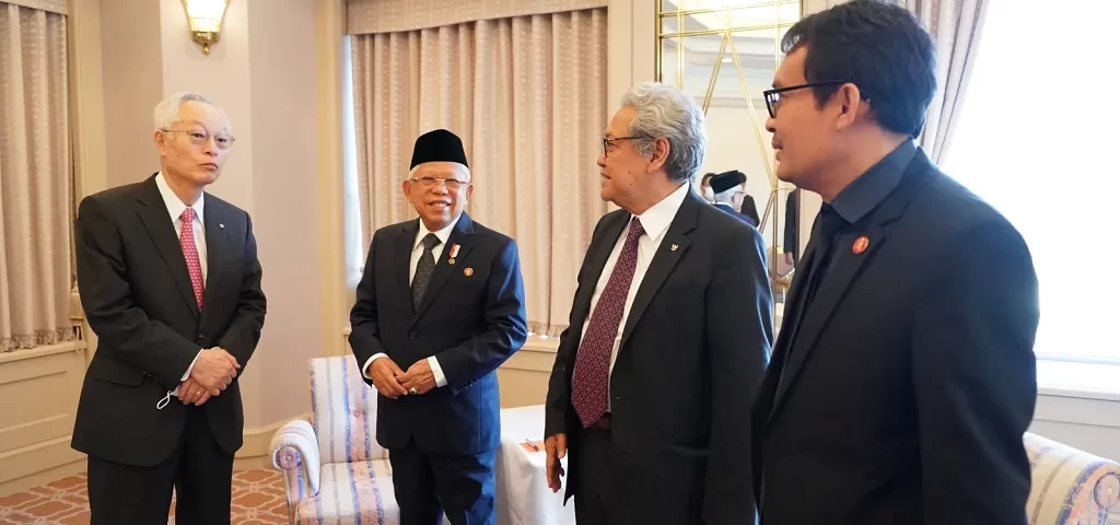 Sementara Wapres didampingi Duta Besar (Dubes) RI untuk Jepang dan Federasi Mikronesia Heri Akhmadi, Kepala Sekretariat Wakil Presiden Ahmad Erani Yustika, Deputi Bidang Dukungan Kebijakan Pembangunan Ekonomi dan Peningkatan Daya Saing Guntur Iman Nefianto, Staf Khusus Wapres Bidang Komunikasi dan Informasi Masduki Baidlowi, Tim Ahli Wakil Presiden Farhat Brachma, Konsul Jenderal RI Osaka Diana Emilla Sari Sutikno Konjen RI Osaka, dan Plt. Direktur Eksekutif Komite Nasional Ekonomi dan Keuangan Syariah Taufik Hidayat. (SK-BPMI, Setwapres)
