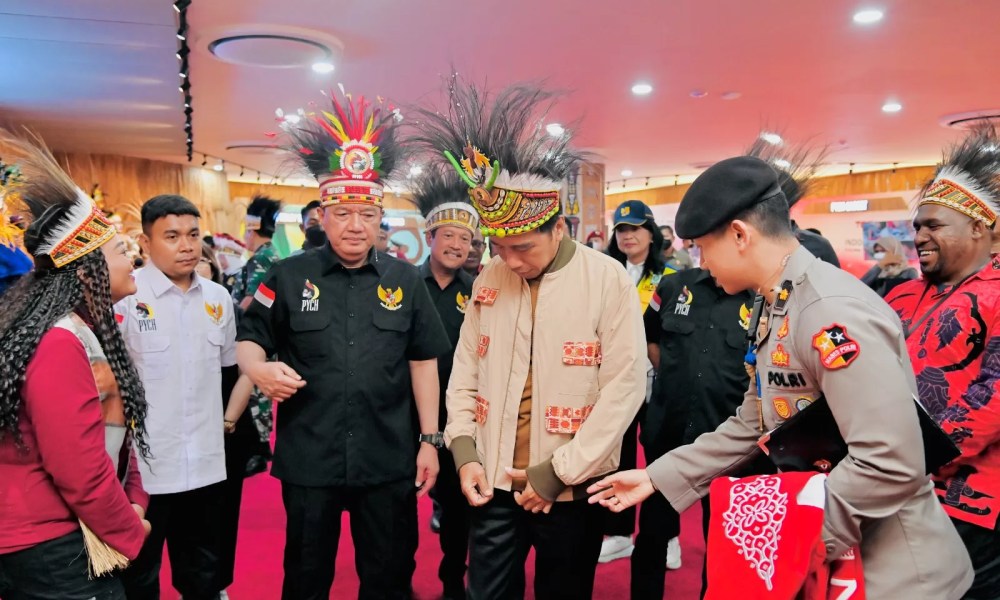 Presiden RI Joko Widodo (Jokowi) meninjau sejumlah stan produk yang dihasilkan oleh para pemuda Papua di Papua Youth Creative Hub (PYCH), Jayapura, pada Selasa (21/03/2023). Dalam peninjauan tersebut, Presiden mendapat hadiah berupa jaket dari seorang perancang busana asli Papua, Eunike Yunita.