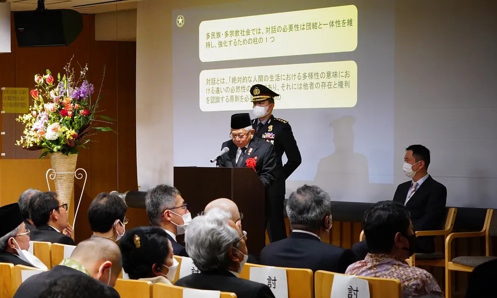 “Pilihan investasi penyelenggaraan dialog lintas agama semakin tepat dan semakin urgen saat ini dibandingkan dengan masa-masa lalu. Budaya dialog merupakan sarana ideal untuk membangun jembatan komunikasi antarpemeluk agama dan internal agama. Di sisi lain, tepat sekali, ketika ada banyak referensi kognitif, persepsi budaya berbeda, perbedaan posisi politik, kebutuhan akan dialog menjadi nyata, terutama melalui sentuhan kedekatan antar sesama pemeluk agama dengan menciptakan ruang bersama untuk kerja sama dan komunikasi yang menyejukkan,” tutur Wakil Presiden (Wapres) K.H. Ma’ruf Amin saat memberikan Kuliah Umum dihadapan sejumlah Civitas Akademika Universitas Kyoto di Symposium Hall, Kyoto University, Jepang, Rabu (08/03/2023).