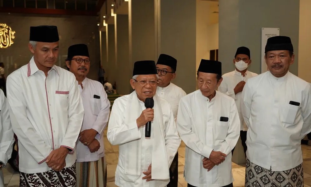 Mendampingi Wapres pada konferensi pers kali ini, Gubernur Jawa Tengah Ganjar Pranowo dan Ketua Majelis Ulama Indonesia (MUI) Jawa Tengah K.H. Ahmad Darodji. (EP-rls)