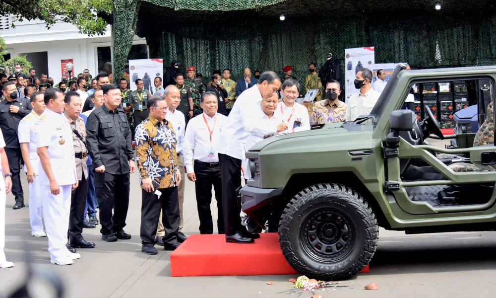 Usai memberikan arahan dalam Rapat Pimpinan Kementerian Pertahanan (Rapim Kemhan) Tahun 2023, Presiden RI Joko Widodo (Jokowi) menjajal kendaraan operasional satuan yang dijuluki “Maung” di halaman Kemhan, Jakarta, Rabu (18/01/2023). Presiden juga meresmikan nama “Maung” untuk kendaraan tersebut.