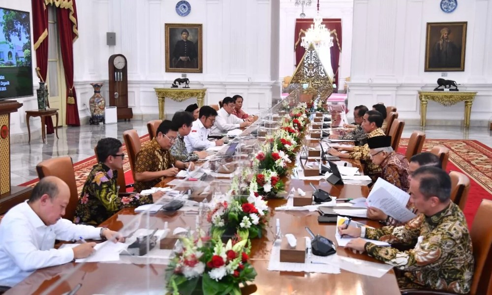 Presiden Joko Widodo memimpin rapat terbatas bersama jajarannya di Istana Merdeka, Jakarta, pada Kamis, 27 April 2023. Dalam rapat tersebut, Presiden meminta pengurangan ketergantungan terhadap pupuk kimia dengan meningkatkan penggunaan pupuk organik bagi para petani.