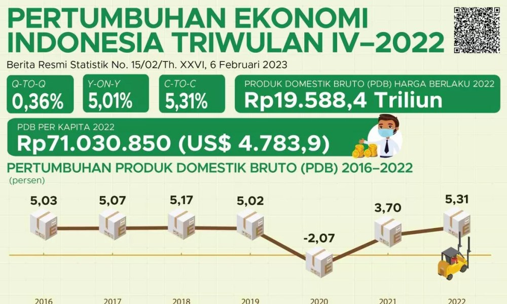 Badan Pusat Statistik (BPS) mencatat perekonomian Indonesia pada tahun 2022 berhasil tumbuh 5,31 persen dibanding tahun sebelumnya (year-on-year/yoy).  Perekonomian domestik tahun 2022 berhasil tumbuh berkat tingginya pertumbuhan pada triwulan IV-2022 yang naik 5,01 persen (yoy).