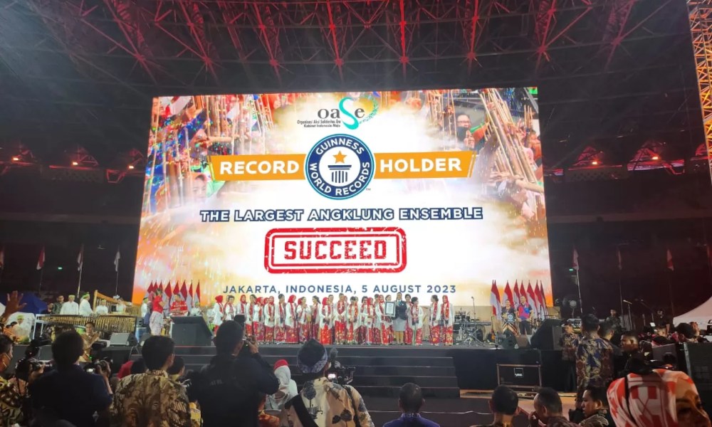 Indonesia berhasil memecahkan rekor dunia untuk pergelaran angklung terbesar, di Stadion Utama Gelora Bung Karno (GBK), Sabtu (05/08/2023). Rekor pergelaran angklung yang dicatat oleh Guinness World Records (GWR) tersebut diikuti oleh 15.110 peserta.