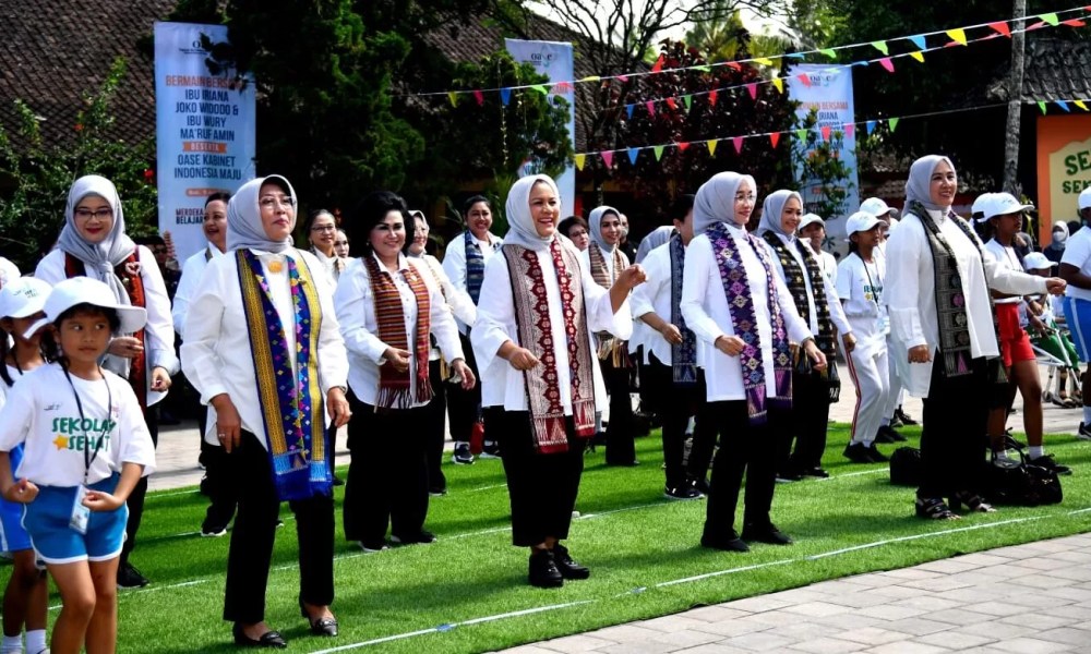Tidak hanya itu, di lapangan sekolah tersebut, Ibu Iriana, Ibu Wury, dan para anggota OASE KIM kemudian melaksanakan senam sekolah sehat bersama perwakilan 100 orang anak-anak SD dari Provinsi Bali. Dalam olahraga bersama tersebut, terlihat Ibu Iriana bersemangat mengikuti setiap gerakan senam yang dipandu oleh dua orang siswa SD.