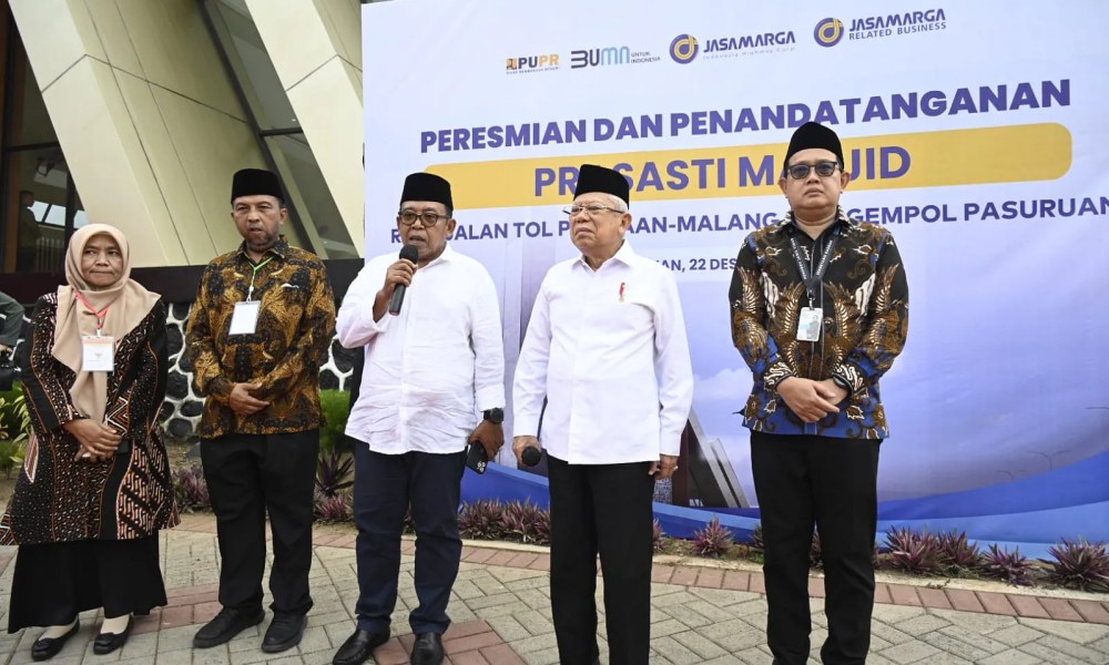 Tampak mendampingi Wapres saat memberikan keterangan pers, Bupati Pasuruan Irsyad Yusuf, Sekretaris Daerah Pemprov Jawa Timur Adhy Karyono, Direktur Keuangan dan Manajemen Risiko Jasa Marga Transjawa Tol Siti Sarah, serta Staf Khusus Wapres Bidang Komunikasi dan Informasi Masduki Baidlowi. (RN-rls)