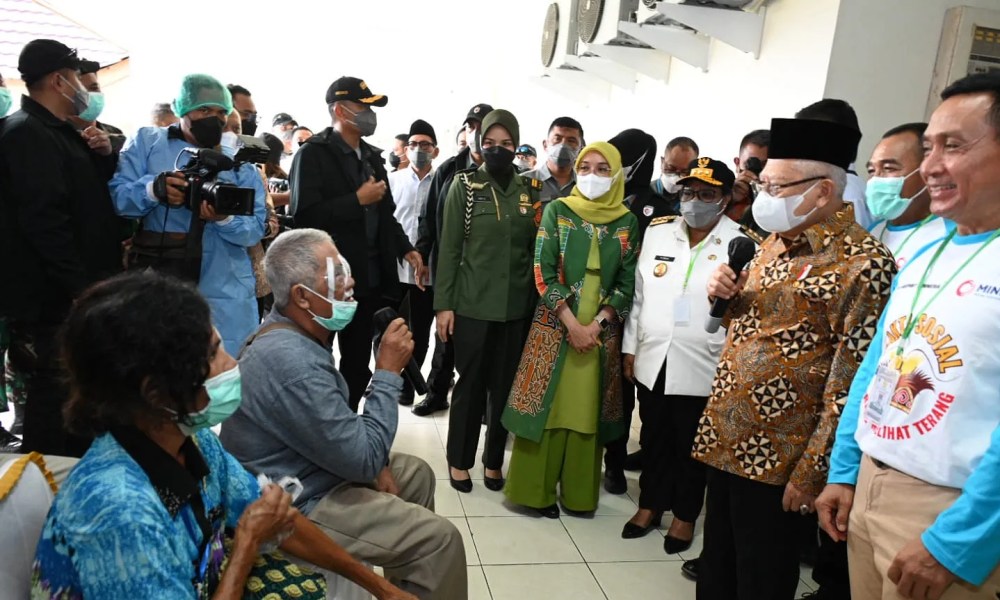 Wapres berkesempatan menyapa para pasien operasi katarak dan bibir sumbing yang tampak sedang mengantre untuk dilakukan tindakan operasi.