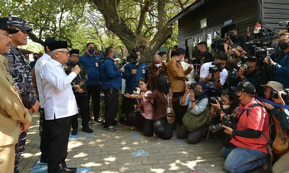 Mendampingi Wapres dalam keterangan persnya hari ini, Menteri Kelautan dan Perikanan Sakti Wahyu Trenggono, Kepala Staf TNI Angkatan Laut Laksamana Muhammad Ali, Bupati Kepulauan Seribu Junaedi, Inspektur Jenderal TNI Bambang Suswantono, dan Staf Khusus Wapres Bidang Komunikasi dan Informasi Masduki Baidlowi.