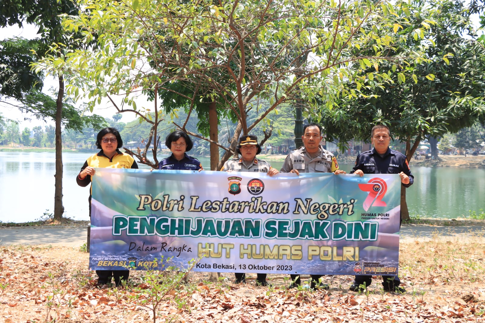 WACANA.ID – – Polres Metro Bekasi Kota laksanakan kegiatan penanaman pohon dalam rangka menyambut HUT Humas Polri ke-72 yang bertemakan ‘Polri Lestarikan Negeri Penghijauan Sejak Dini’ di lokasi Area Danau Duta Harapan, Harapan Baru, Bekasi Utara, Jumat (13/10/2023) pagi.
