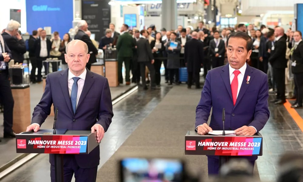 Hal tersebut disampaikan oleh Presiden Jokowi dalam keterangannya usai meninjau sejumlah stan yang ada di Hannover Messe 2023, pada Senin (17/04/2023). Tampak Kanselir Jerman Olaf Scholz turut meninjau stan bersama Presiden dan Ibu Iriana.