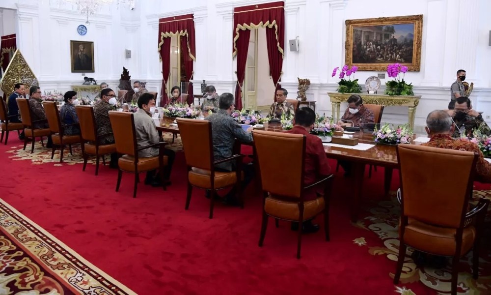Turut mendampingi Presiden dalam pertemuan tersebut yaitu Menteri Koordinator Bidang Perekonomian Airlangga Hartarto, Menteri Keuangan Sri Mulyani, dan Sekretaris Kabinet Pramono Anung.