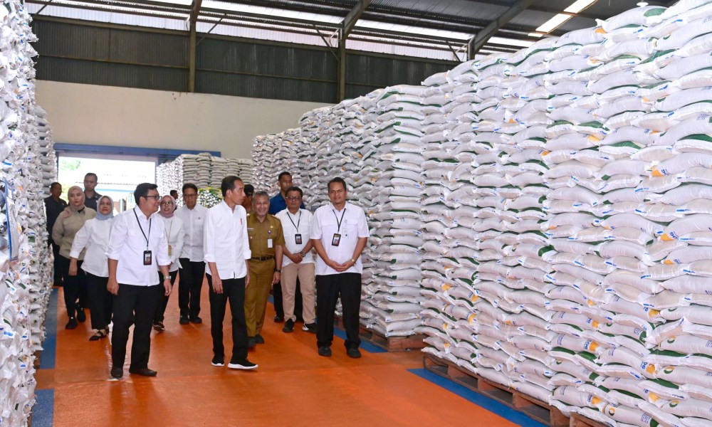Presiden RI Joko Widodo (Jokowi) mengecek langsung cadangan beras yang ada di Gudang Bulog Bengkal Lor, Kabupaten Temanggung, Jawa Tengah, Senin (22/01/2024). Dalam kunjungan tersebut, Presiden Jokowi turut berdialog dan menyerahkan bantuan pangan cadangan pangan pemerintah (CBP) kepada sejumlah penerima manfaat.