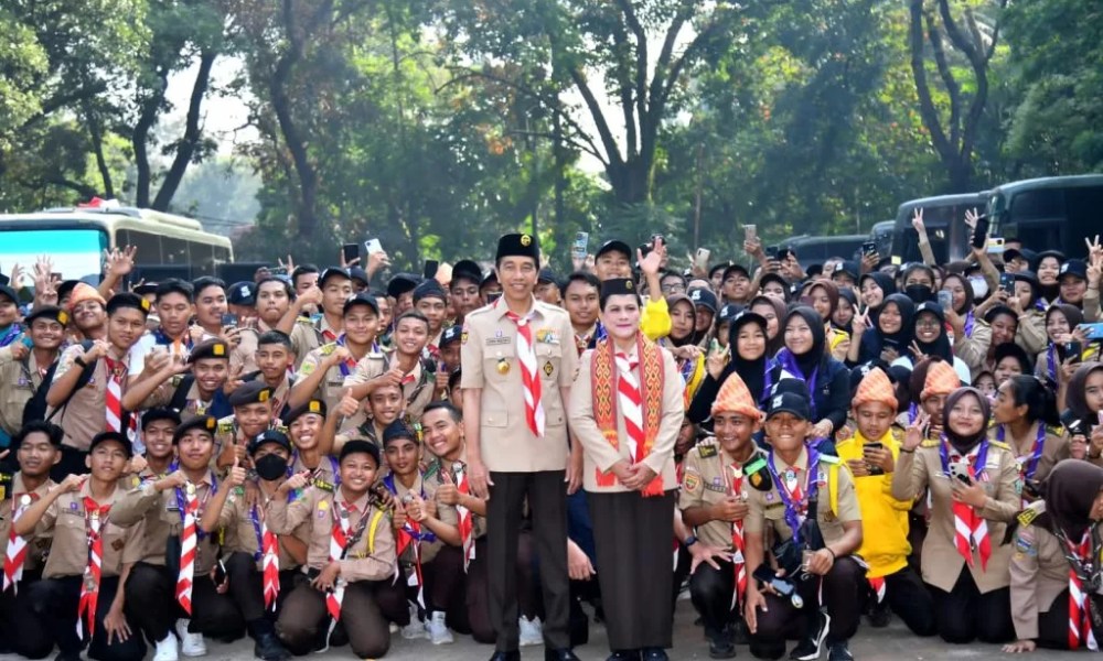 Presiden RI Joko Widodo (Jokowi) dan Ibu Iriana Jokowi meninjau langsung kegiatan Raimuna Nasional XII Gerakan Pramuka Tahun 2023 yang digelar di Bumi Perkemahan Pramuka Cibubur, Jakarta, pada Selasa (15/08/2023). Berseragam Pramuka lengkap, Presiden dan Ibu Iriana tiba di lokasi kegiatan sekitar pukul 07.26 WIB.