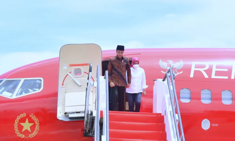 Presiden RI Joko Widodo (Jokowi) didampingi Ibu Iriana Joko Widodo tiba di Bandara Internasional Sultan Aji Muhammad Sulaiman Sepinggan, Kota Balikpapan, Provinsi Kalimantan Timur, pada Rabu (22/02/2023), sekira pukul 12.48 WITA.