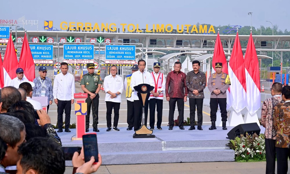 Presiden Joko Widodo meresmikan jalan tol Pamulang-Cinere-Raya Bogor yang digelar di Gerbang Tol Limo Utara, Kota Depok, Provinsi Jawa Barat, pada Senin, 8 Januari 2024. Presiden menyebut jalan tol tersebut memiliki total panjang 14,8 km dengan total investasi sebesar Rp4 triliun.