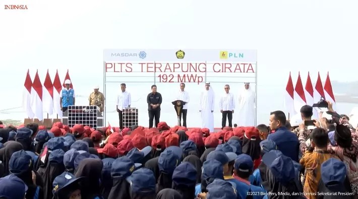 Presiden Joko Widodo (Jokowi) meresmikan Pembangkit Listrik Tenaga Surya (PLTS) Terapung Cirata 192 MWP, Kamis (09/11/2023) di Kabupaten Purwakarta, Jawa Barat. Presiden mengatakan infrastruktur ini merupakan PLTS terapung terbesar di Asia Tenggara dan ketiga di dunia.