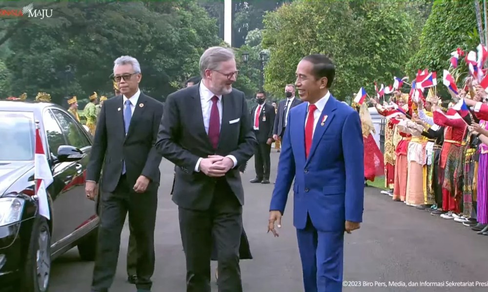 PM Petr Fiala tiba di halaman Istana Kepresidenan Bogor sekitar pukul 16.00 WIB diiringi pasukan berkuda dan marching band pasukan pengamanan presiden (paspampres).