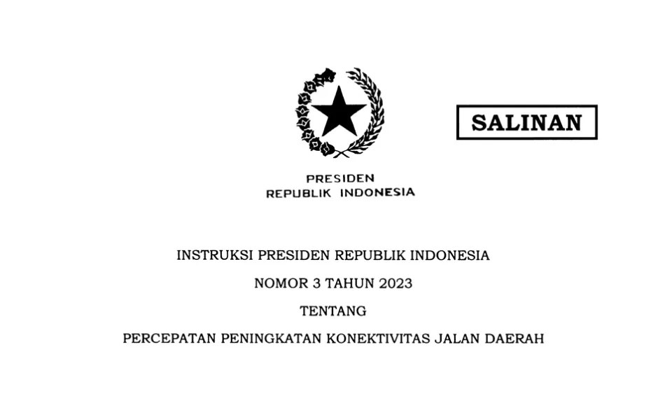 Presiden RI Joko Widodo (Jokowi) mengeluarkan Instruksi Presiden Republik Indonesia (Inpres) Nomor 3 Tahun 2022 tentang Percepatan Peningkatan Konektivitas Jalan Daerah.