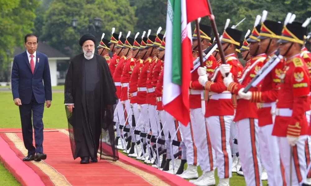 Setiba di halaman depan Istana, Presiden Raisi langsung disambut oleh Presiden Jokowi. Prosesi kemudian dilanjutkan dengan upacara kenegaraan dengan mengumandangkan lagu kebangsaan Iran, Sorude Melliye Johuriye Esleomiye Ireon dan lagu kebangsaan Indonesia, Indonesia Raya diiringi dentuman meriam sebanyak 22 kali. Selanjutnya kedua pemimpin melakukan inspeksi jajar kehormatan.