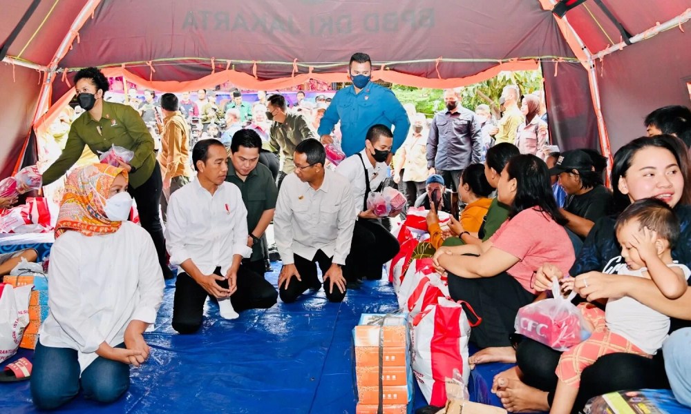 Presiden Joko Widodo didampingi Ibu Iriana Joko Widodo meninjau langsung posko pengungsian korban kebakaran Terminal Bahan Bakar Minyak (TBBM) Pertamina Plumpang yang ada di Ruang Publik Terpadu Ramah Anak (RPTRA) Rasela, Rawa Badak Selatan, Jakarta, pada Minggu, 5 Maret 2023.