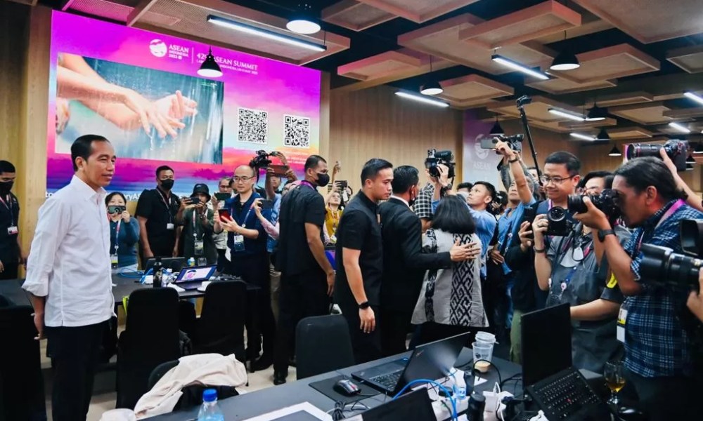 Presiden RI Joko Widodo (Jokowi) meninjau langsung pusat media atau media center Konferensi Tingkat Tinggi (KTT) ke-42 ASEAN di Hotel Bintang Flores, Labuan Bajo, Kabupaten Manggarai Barat, Provinsi Nusa Tenggara Timur (NTT) pada Selasa (09/05/2023). Setibanya di Hotel Bintang Flores sekitar pukul 13.20 WITA, Presiden Jokowi langsung menuju area lobi dan meja registrasi untuk para jurnalis yang meliput perhelatan KTT ke-42 ASEAN.