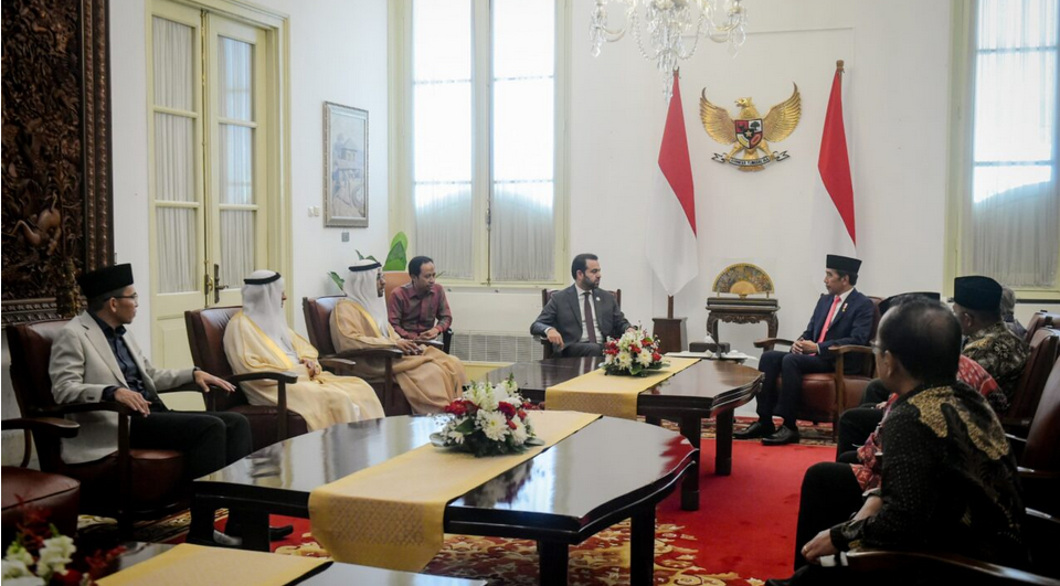 Presiden Joko Widodo menerima Majelis Hukama Muslimin (MHM) di Istana Merdeka, Jakarta, pada Kamis, 5 Oktober 2023. Menteri Koordinator Bidang Pembangunan Manusia dan Kebudayaan (Menko PMK) Muhadjir Effendy mengatakan, kunjungan MHM dimaksudkan untuk menyampaikan telah diresmikannya kantor cabang MHM untuk Asia Tenggara yang dibangun di Jakarta.