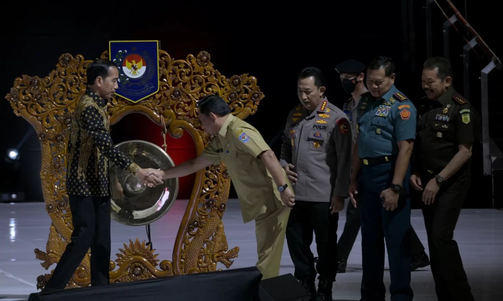 Presiden Jokowi didampingi sejumlah pejabat saat membuka Rakornas Kepala Daerah dan Forkopimda se-Indonesia Tahun 2023, di SICC, Sentul, Jawa Barat, Selasa (17/01/2023). (Foto: Humas Setkab/Oji)