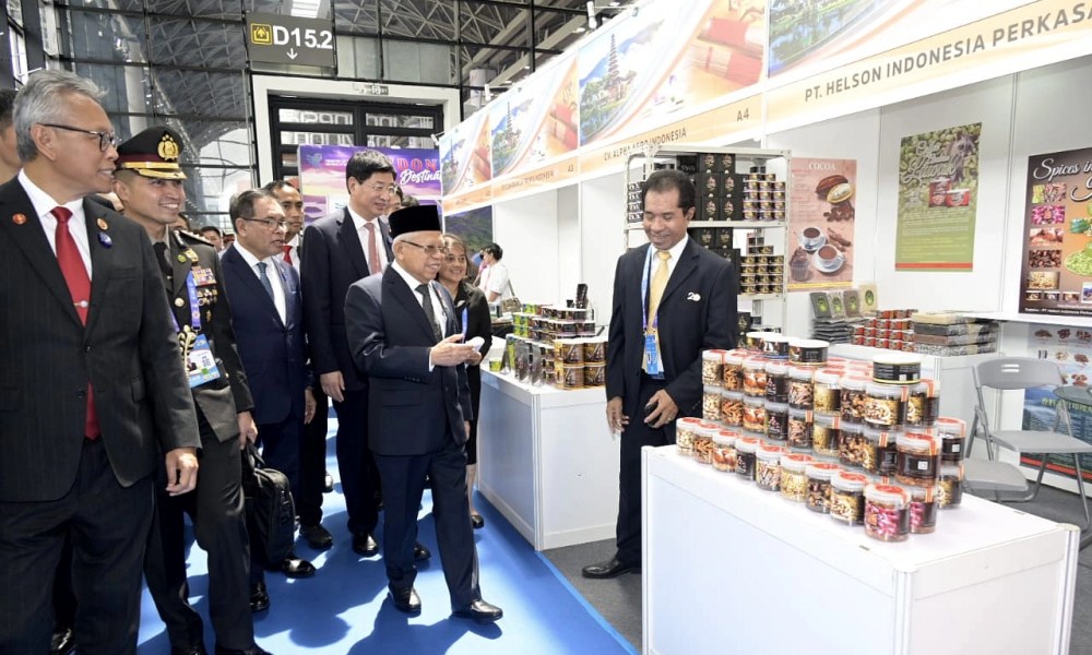 Usai melakukan prosesi pembukaan, Wapres kemudian meninjau berbagai stand pameran produk unggulan Indonesia yang ada di Paviliun Komoditas Indonesia.