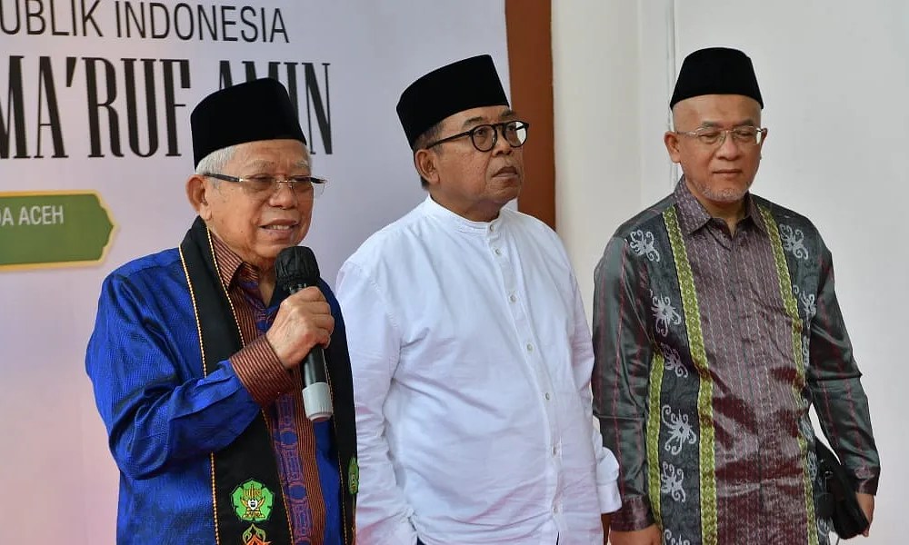 Mendampingi Wapres pada keterangan pers kali ini, Rektor UIN Ar-Raniry Banda Aceh Mujiburrahman, Plt. Direktur Eksekutif Komite Nasional Ekonomi dan Keuangan Syariah (KNEKS) Taufik Hidayat, dan Staf Khusus Wapres Bidang Komunikasi dan Informasi Masduki Baidlowi. (EP/RJP-rls)