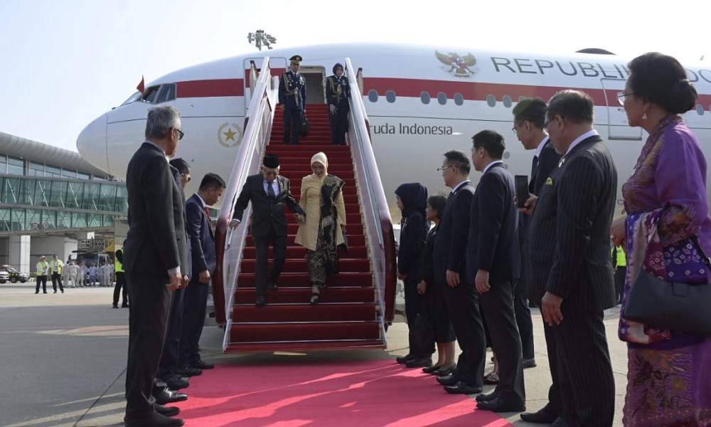 Saat Pesawat Garuda Indonesia (GIA-2) mendarat di negeri Tirai Bambu ini, Wapres disambut oleh Wakil Gubernur Provinsi Fujian H. E. Mr. Wang Jinfu, Duta Besar RI untuk RRT Djauhari Oratmangun beserta Ibu Sih Elsiwi Handayani Oratmangun, dan Atase Pertahanan (Athan) RI Beijing Kolonel Mar. Benny Poltak Nadeak beserta Ibu Desy Sulastri Tampubolon.