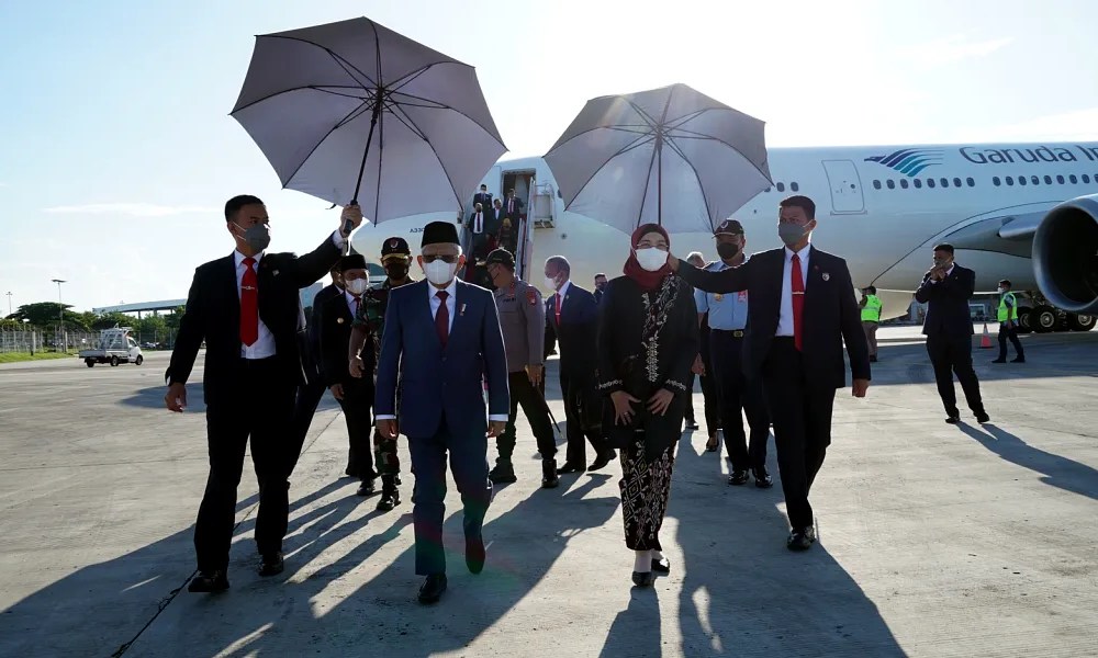 Di bandara, Wapres disambut oleh Pj. Gubernur Banten Al Muktabar, Pangdam Jaya Mayjen TNI Untung Budiharto, Kapolda Metro Jaya , Irjen Pol. M. Fadil Imran. serta Dan Lanud Halim Perdana Kusuma Marsekal Pertama TNI Adrian P. Damanik.