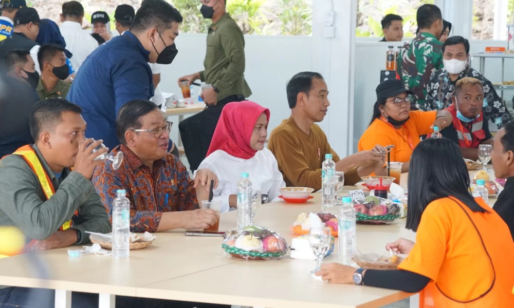 Kemudian, Kepala Negara langsung menuju kantin untuk makan siang bersama dengan para pekerja konstruksi. Saat memasuki kantin, ia tampak tersenyum hangat dan menyapa para pekerja konstruksi yang tiba lebih awal.