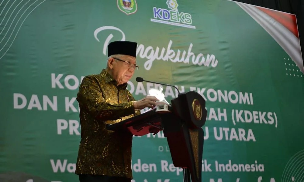 “Dalam mendorong terciptanya ekosistem dan infrastruktur syariah diharapkan KDEKS Maluku Utara dapat meningkatkan literasi dan pengetahuan tentang ekonomi dan keuangan syariah,” ujar Wakil Presiden (Wapres) K. H. Ma’ruf Amin saat memberikan sambutannya pada Pengukuhan KDEKS Provinsi Maluku Utara yang diselenggarakan di Gamalama Ballroom, Hotel Sahid Bela Ternate, Jl. Jati Raya No. 500, Kecamatan Ternate Selatan, Kota Ternate, Rabu sore (10/05/2023).