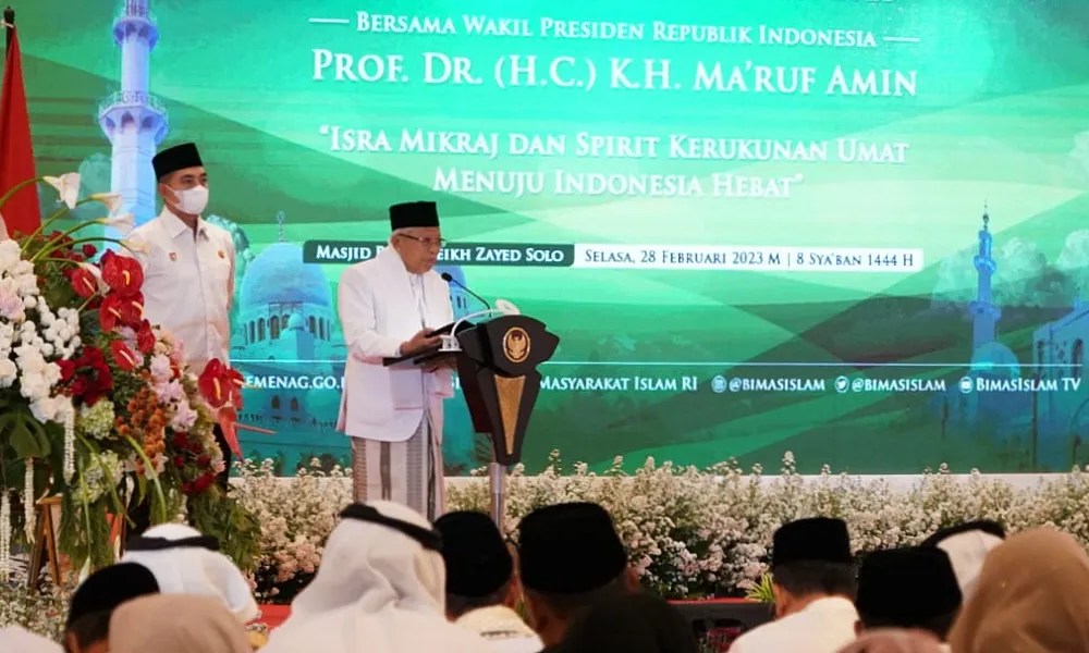 “Kondisi masyarakat yang dihadapi Rasulullah SAW sangat beragam, baik dari aspek agama maupun etnis. Oleh karena itu, diperlukan sikap kepemimpinan yang penuh kesabaran, kebijaksanaan, dan keadilan, namun tetap teguh dalam menyampaikan prinsip-prinsip agama dalam setiap misi dakwahnya,” tutur Wakil Presiden (Wapres) K.H. Ma’ruf Amin saat memberikan sambutan pada acara Peringatan Isra Mi’raj Nabi Muhammad SAW Tingkat Kenegaraan 2023 M/1444 H di Masjid Raya Sheikh Zayed, Solo, Jalan A. Yani No. 128, Gilingan, Kec. Banjarsari, Kota Surakarta, Jawa Tengah, Selasa (28/02/2023).