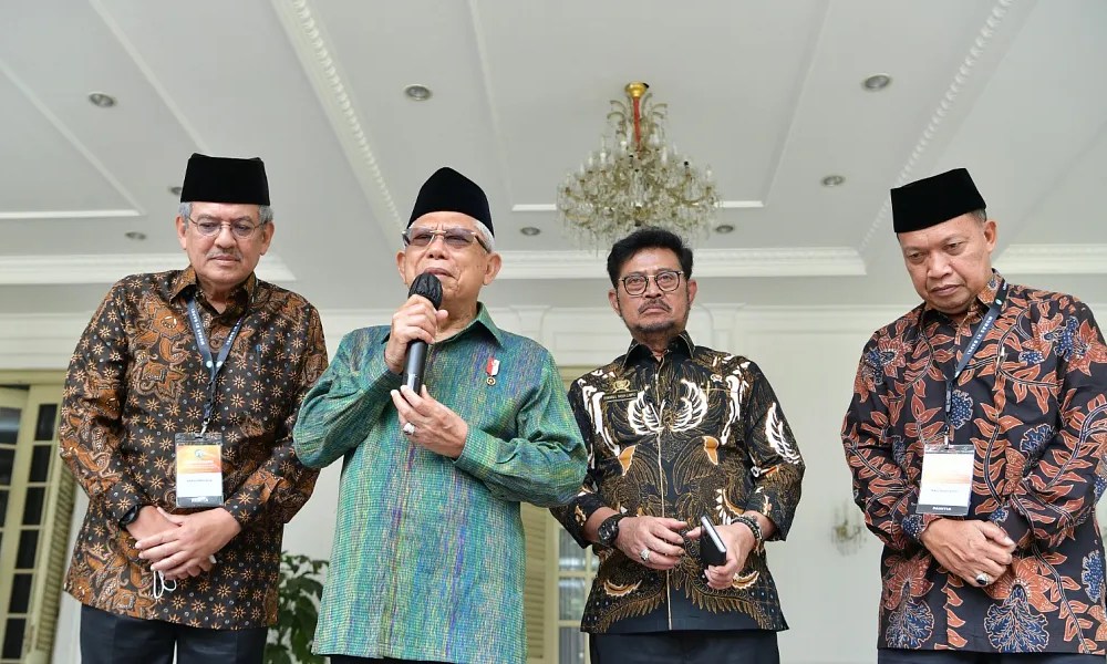 Hadir mendampingi Wapres dalam keterangan pers ini, Menteri Pertanian Syahrul Yasin Limpo, Ketua GAPKI Joko Supriyono dan Staf Khusus Wapres Bidang Komunikasi dan Informasi Masduki Baidlowi. (NN/SK-BPMI, Setwapres)