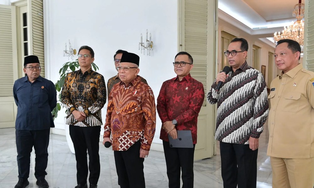 Hadir mendampingi Wapres dalam keterangan pers ini, Menteri Pendayagunaan Aparatur Negara dan Reformasi Birokrasi Abdullah Azwar Anas, Kepala Staf Kepresidenan Moeldoko, Menteri Perhubungan Budi Karya Sumadi, Menteri Kesehatan Budi Gunadi Sadikin, dan Menteri Dalam Negeri Tito Karnavian. (RR/SK-BPMI, Setwapres)
